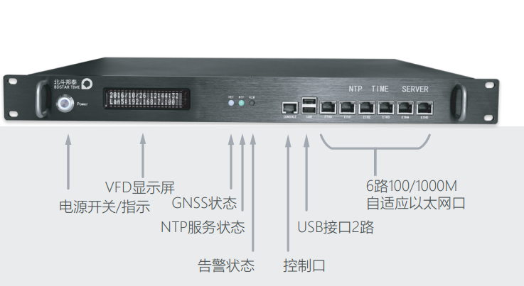 指示 GNSS 锁定状态、NTP 服务状态及设备告警状态等网口:RJ-45,6 路,10/100/1000M 自适应以太网接口