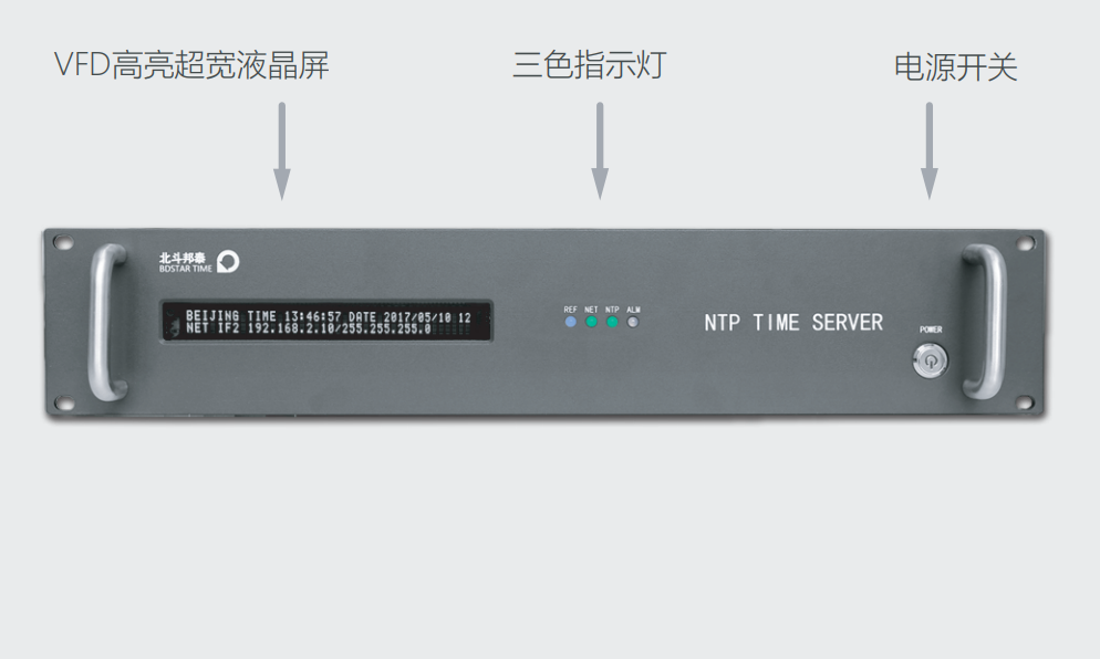 独特的嵌入式硬件设计、高效 Linux 操作系统,可灵 活扩展多种时钟信号输出。全面支持最新 NTP 对时协议、MD5 安全加密协 议及证书加密协议,网络时间精度可达微秒级。同时支持 TOD、10MHz、 1PPS、日志记录、USB 端口升级下载和干接点告警功能,配合北斗邦泰自 主研发的全网时间统一监控软件,轻松实现网络时间同步及有效监控。